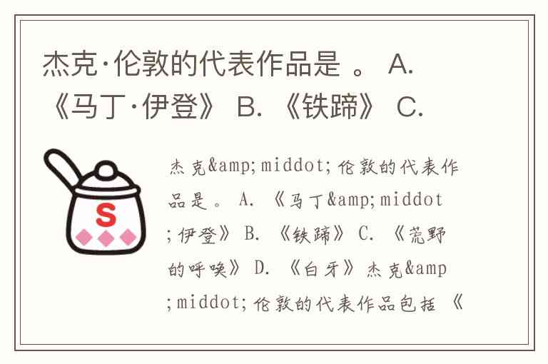 杰克·伦敦的代表作品包括 《马丁·伊登》《铁蹄》《荒野的呼唤》《白牙》 等多部经典。如果题目是单选题,通常认为《马丁·伊登》(半自传体小说,最具文学深度)或《荒野的呼唤》(最具国际知名度)为其最突出的代表作,具体需看题目语境。