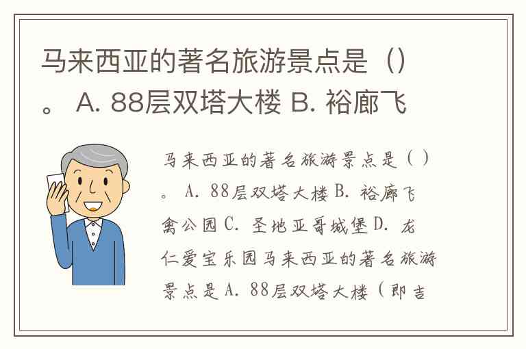 马来西亚的著名旅游景点是()。 A. 88层双塔大楼 B. 裕廊飞禽公园 C. 圣地亚哥城堡 D. 龙仁爱宝乐园
