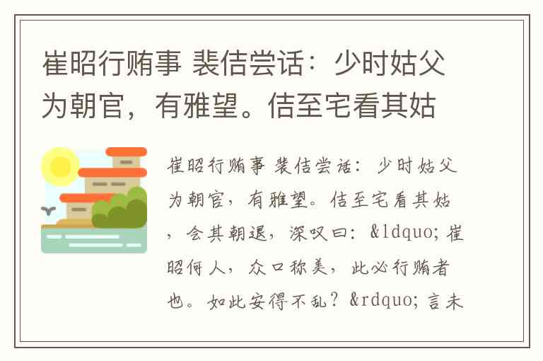 崔昭行贿事 裴佶尝话:少时姑父为朝官,有雅望。佶至宅看其姑,会其朝退,深叹曰:“崔昭何人,众口称美,此必行贿者也。如此安得不乱?”言未竟,阍者报寿州崔使君候谒。姑父怒呵阍者,将鞭之。良久,束带强出。须臾,命茶甚急,又命酒馔,又命秣马饭仆。姑曰:“前何倨而后何恭也?”及入门,有得色,揖佶曰:“且憩学院中。”佶未下阶,出怀中一纸,乃昭赠官絁匹。 (选自李肇《唐国史补》) 注释:裴佶,字弘正。唐德宗时官至工部尚书。阍者,看门人。寿州,治所在今安徽寿县。使君,对州郡长官的尊称。学院,书房。絁,音shī,粗绸。 1.下列划线的词语解释有误的一项是 [ ] A.佶至宅看其姑,会其朝退 会:恰逢。 B.阍者报寿州崔使君候谒 谒:拜见。 C.良久,束带强出 强:勉强。 D.出怀中一纸,乃昭赠官絁千匹 昭:显示。2.下列对“之”字的用法判断正确的一项是 [ ] ①姑父怒呵阍者,将鞭之 ②以天下之所顺,攻亲戚之所畔 ③其言,兹若人之俦乎? ④马之千里者,一食或尽粟一石 ⑤欲报之于陛下也 ⑥辍耕之垄上 A.①③相同 B.②⑤相同 C.①⑤相同 D.④⑥相同3. 下列关于文章内容的理解,解说有错的一项是 [ ] A.裴佶的姑父年轻时做朝官,有很好的声誉。 B.崔昭得到大家的称赞,裴佶的姑父因此推断崔昭是个会行贿的人。 C.姑父“前倨”是因为崔昭未曾向他行贿,“后恭”是因为崔昭送了他官绸一千匹。 D.裴佶的姑父其实是个徒有高尚声誉的贪官。