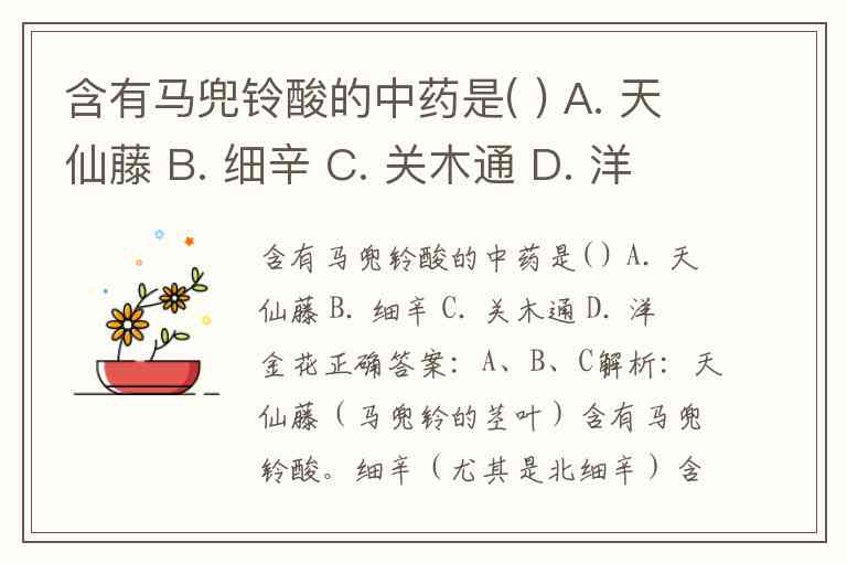 含有马兜铃酸的中药是( ) A. 天仙藤 B. 细辛 C. 关木通 D. 洋金花