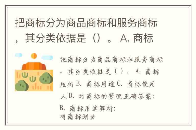 把商标分为商品商标和服务商标,其分类依据是()。 A. 商标结构 B. 商标用途 C. 商标使用人 D. 对商标的管理