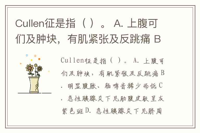 Cullen征是指( )。 A. 上腹可们及肿块,有肌紧张及反跳痛 B. 明显腹胀、肠鸣音稀少而低 C. 急性胰腺炎下见肋腹皮肤呈灰紫色斑 D. 急性胰腺炎下见脐周皮肤青紫 E. 胆总管或壶腹嵌顿性结石时出现黄疸