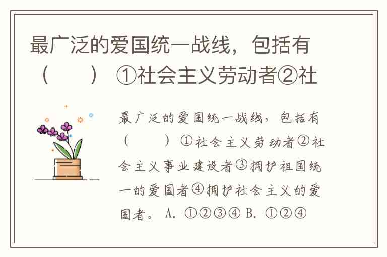 最广泛的爱国统一战线,包括有( ) ①社会主义劳动者②社会主义事业建设者③拥护祖国统一的爱国者④拥护社会主义的爱国者。 A. ①②③④ B. ①②④ C. ①②③ D. ①③④