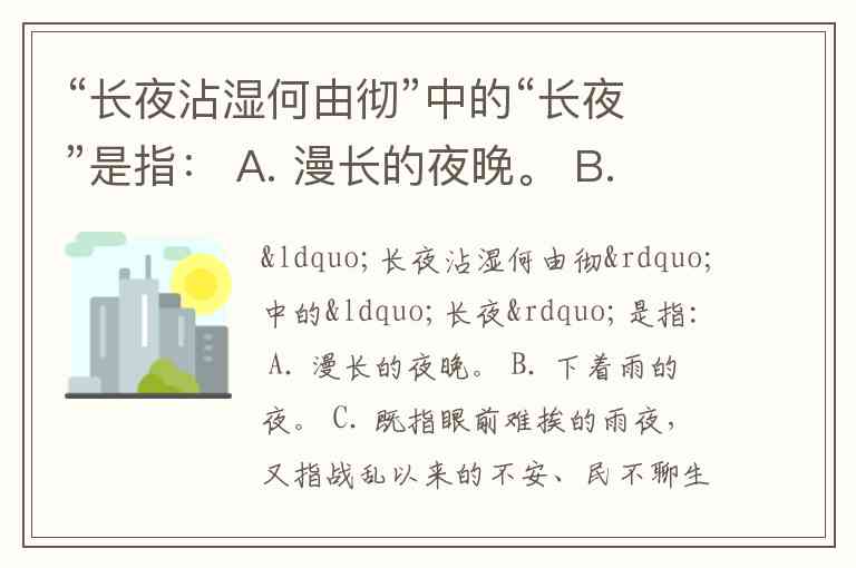 “长夜沾湿何由彻”中的“长夜”是指: A. 漫长的夜晚。 B. 下着雨的夜。 C. 既指眼前难挨的雨夜,又指战乱以来的不安、民不聊生的时局。 D. 未来的夜晚。