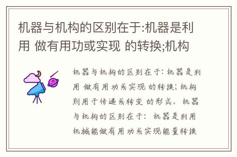 机器与机构的区别在于:机器是利用机械能做有用功或实现能量转换;机构则用于传递或转变运动和力的形式。
