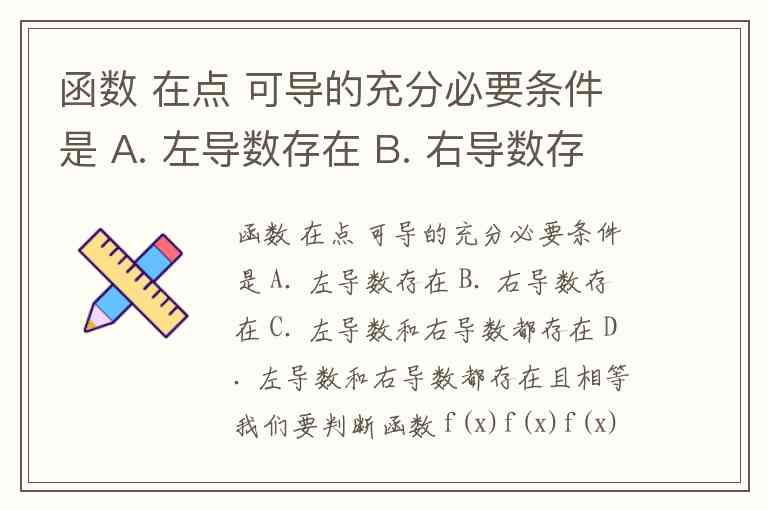 函数 在点 可导的充分必要条件是 A. 左导数存在 B. 右导数存在 C. 左导数和右导数都存在 D. 左导数和右导数都存在且相等
