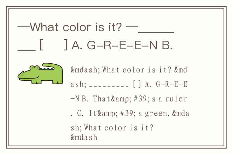 A. “G-R-E-E-N” 是用来拼写单词的,用来回答 “How do you spell ‘green’?”B. “That’s a ruler.” 是回答 “What’s that?” 这类的问题,和颜色无关。所以正确答案是 C。