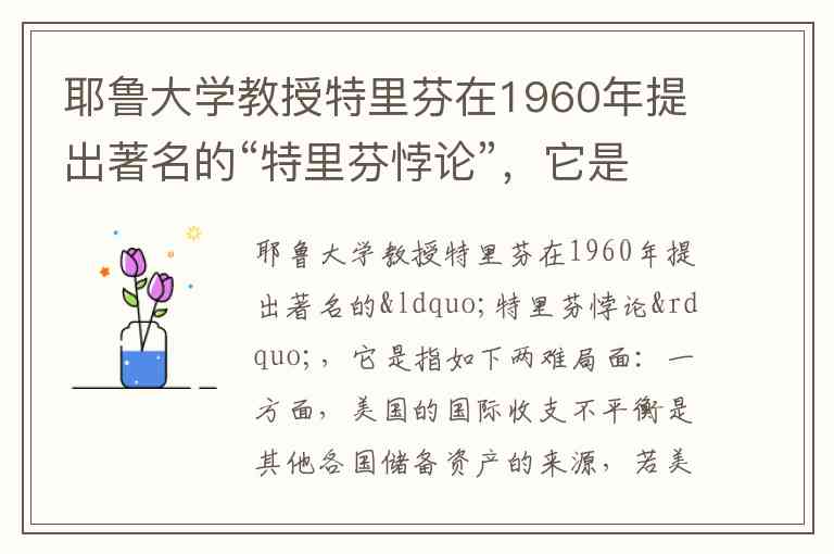 我们先来分析题干的关键信息:“特里芬悖论”指出了在布雷顿森林体系下,美国作为核心货币发行国面临的两难困境:一方面,世界需要美元(通过美国国际收支逆差)来增加国际流动性;另一方面,长期逆差又会导致美元贬值压力,动摇各国对美元兑换黄金的信心。