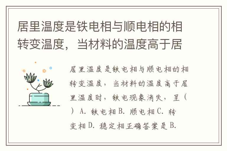 居里温度是铁电相与顺电相的相转变温度,当材料的温度高于居里温度时,铁电现象消失,呈() A. 铁电相 B. 顺电相 C. 转变相 D. 稳定相