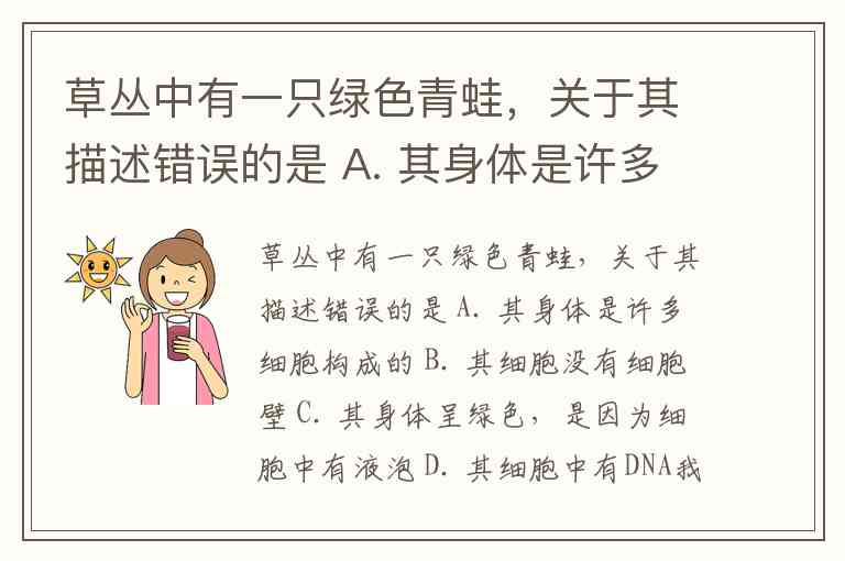 草丛中有一只绿色青蛙,关于其描述错误的是 A. 其身体是许多细胞构成的 B. 其细胞没有细胞壁 C. 其身体呈绿色,是因为细胞中有液泡 D. 其细胞中有DNA