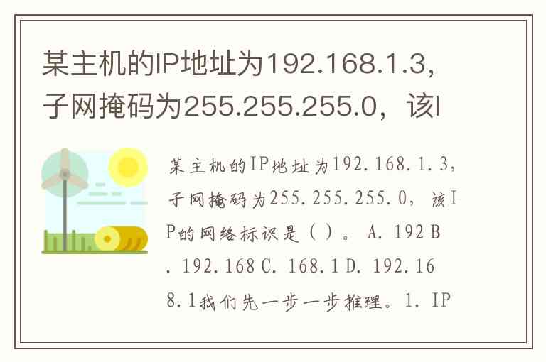 某主机的IP地址为192.168.1.3,子网掩码为255.255.255.0,该IP的网络标识是()。 A. 192 B. 192.168 C. 168.1 D. 192.168.1