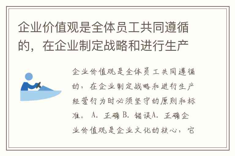 企业价值观是全体员工共同遵循的,在企业制定战略和进行生产经营行为时必须坚守的原则和标准。 A. 正确 B. 错误