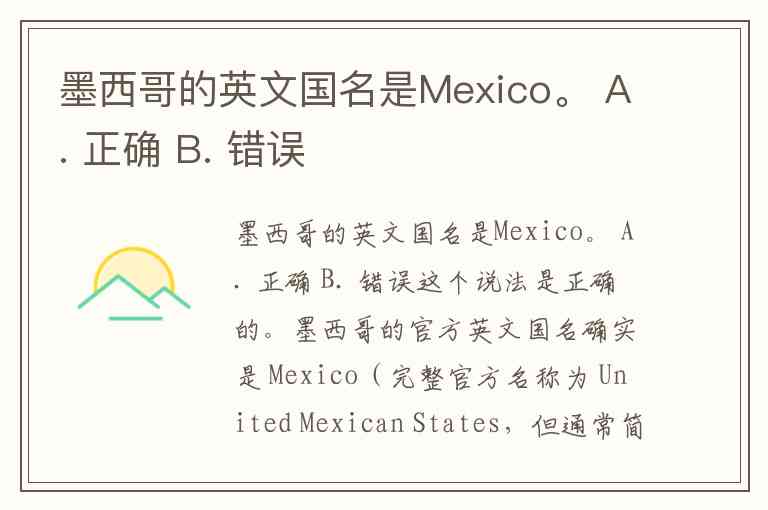 墨西哥的英文国名是Mexico。 A. 正确 B. 错误