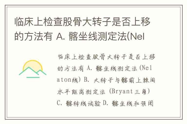 临床上检查股骨大转子是否上移的方法有 A. 髂坐线测定法(Nelaton线) B. 大转子与髂前上棘间水平距离测定法 (Bryant三角) C. 髂转线试验 D. 髂坐线和颈闭孔线测定法 E. 髂转线、髂坐线和颈闭孔线测定法