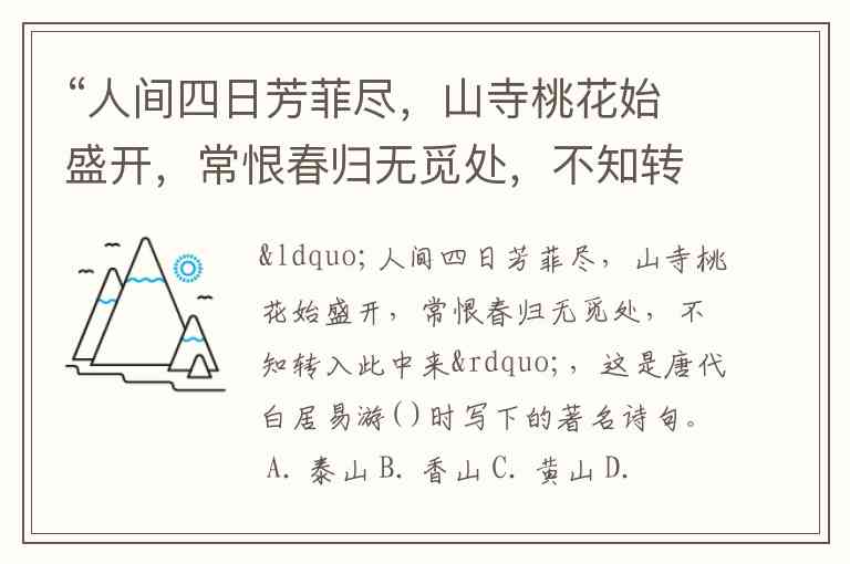 “人间四日芳菲尽,山寺桃花始盛开,常恨春归无觅处,不知转入此中来”,这是唐代白居易游( )时写下的著名诗句。 A. 泰山 B. 香山 C. 黄山 D. 庐山