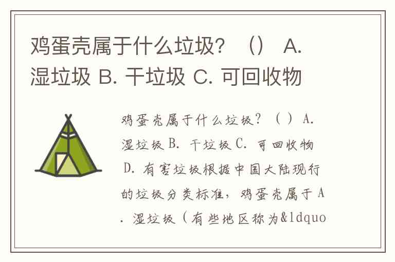 鸡蛋壳属于什么垃圾?() A. 湿垃圾 B. 干垃圾 C. 可回收物 D. 有害垃圾
