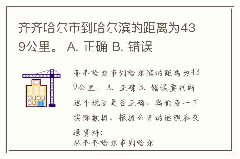 齐齐哈尔市到哈尔滨的距离为439公里。 A. 正确 B. 错误