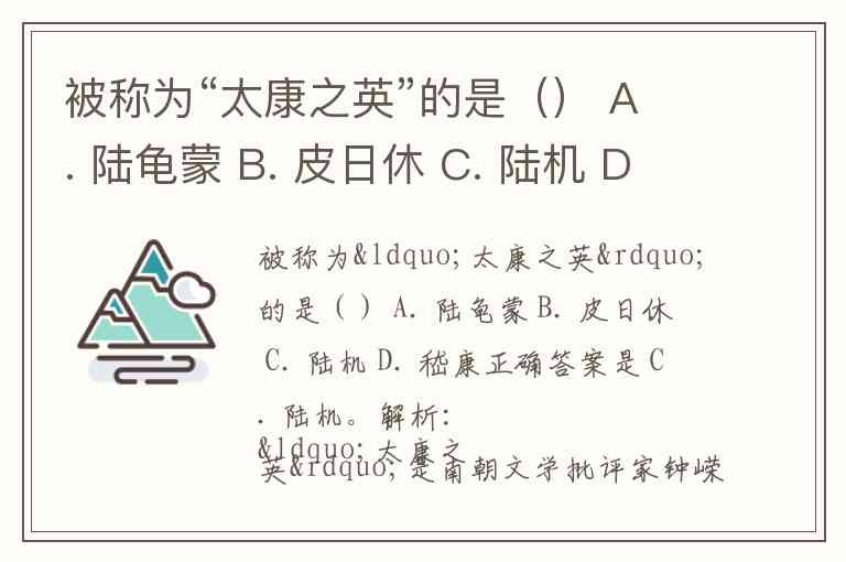 解析:“太康之英”是南朝文学批评家钟嵘在《诗品》中对西晋文学家陆机的评价。太康是西晋武帝的年号(公元280—289年),这一时期文学繁荣,陆机、潘岳等人是代表,其中陆机被推为当时文坛的顶尖人物,故称“太康之英”。