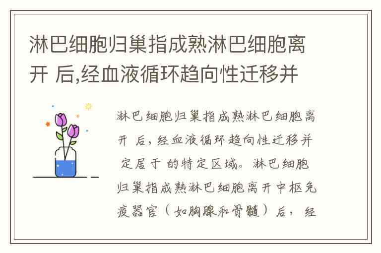 淋巴细胞归巢指成熟淋巴细胞离开中枢免疫器官(如胸腺和骨髓)后,经血液循环趋向性迁移并定居于外周淋巴器官(如淋巴结、脾脏等)的特定区域。