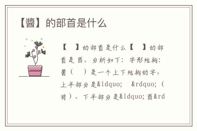 结论:无论是繁体字“醬”还是简体字“酱”,其部首都是 酉。