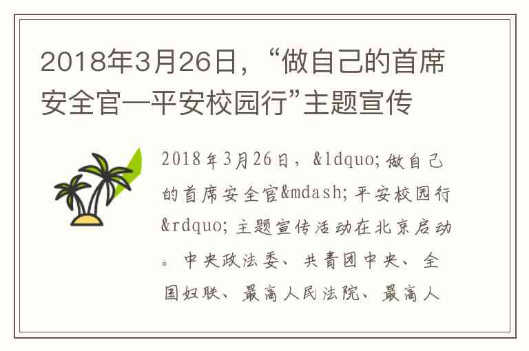 活动主题:“做自己的首席安全官——平安校园行”以及现场参与的部门,有中央政法委、共青团中央、全国妇联、最高法、最高检、民政部、司法部、卫健委等多个部门,说明这不是单一机构的行为。