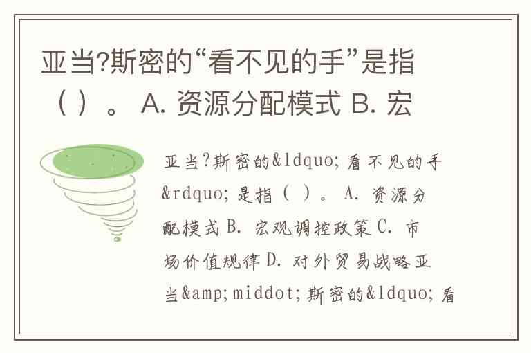 亚当?斯密的“看不见的手”是指( )。 A. 资源分配模式 B. 宏观调控政策 C. 市场价值规律 D. 对外贸易战略