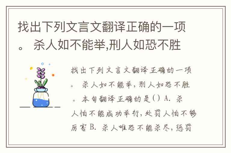 找出下列文言文翻译正确的一项。 杀人如不能举,刑人如恐不胜 。本句翻译正确的是( ) A. 杀人怕不能成功举行,处罚人怕不够厉害 B. 杀人唯恐不能杀尽,惩罚人唯恐不能用尽。 C. 杀人如果都举不起刀,处罚人就更不可能胜任了。 D. 杀人如果刀都举不起来,处罚人恐怕就更不能胜任了。