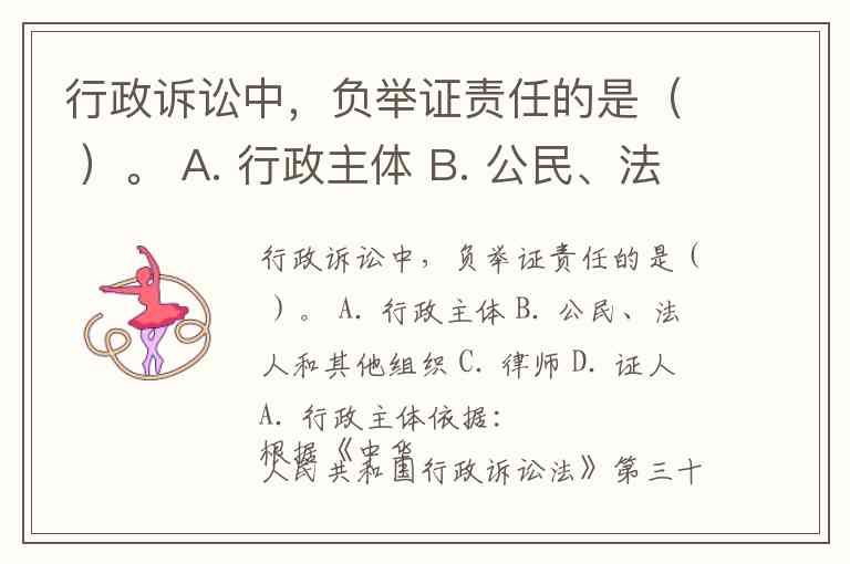 行政诉讼中,负举证责任的是( )。 A. 行政主体 B. 公民、法人和其他组织 C. 律师 D. 证人