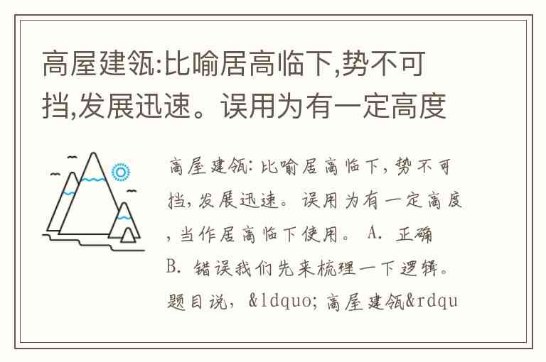 高屋建瓴:比喻居高临下,势不可挡,发展迅速。误用为有一定高度,当作居高临下使用。 A. 正确 B. 错误