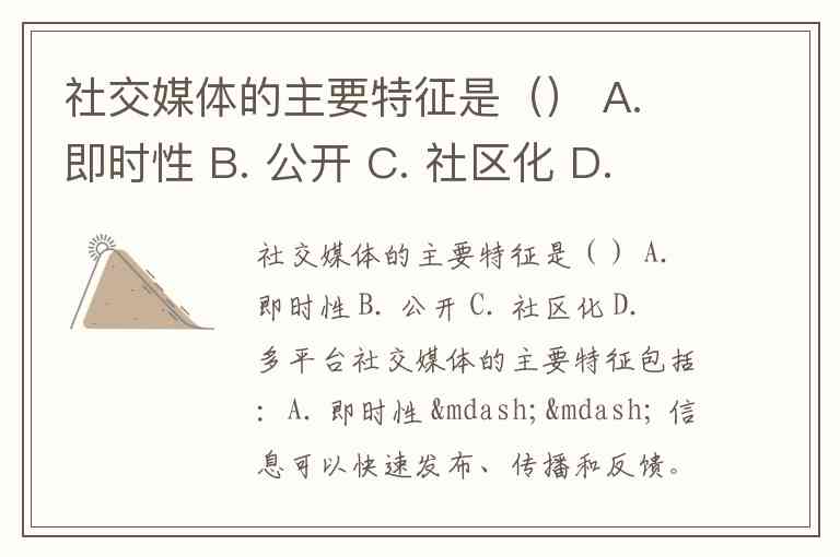 社交媒体的主要特征是() A. 即时性 B. 公开 C. 社区化 D. 多平台