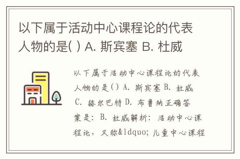 以下属于活动中心课程论的代表人物的是( ) A. 斯宾塞 B. 杜威 C. 赫尔巴特 D. 布鲁纳