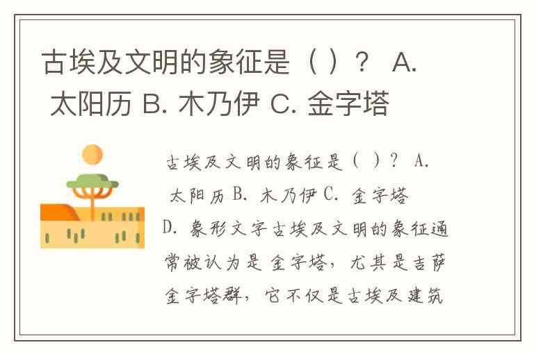 古埃及文明的象征是( )? A. 太阳历 B. 木乃伊 C. 金字塔 D. 象形文字