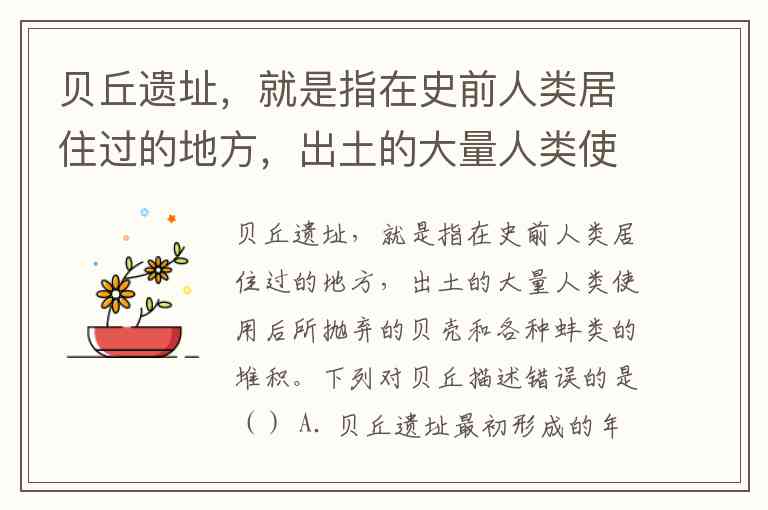 贝丘遗址,就是指在史前人类居住过的地方,出土的大量人类使用后所抛弃的贝壳和各种蚌类的堆积。下列对贝丘描述错误的是() A. 贝丘遗址最初形成的年代大都在新石器时代、青铜时代或延续得更晚 B. 贝丘遗址一般分布在沿海、湖泊以及河流的河口沿岸一带 C. 贝丘遗址代表着海洋文明的起源,是新石器时代海洋渔猎的历史见证 D. 各地的贝丘遗址中贝壳的种类都是一样的