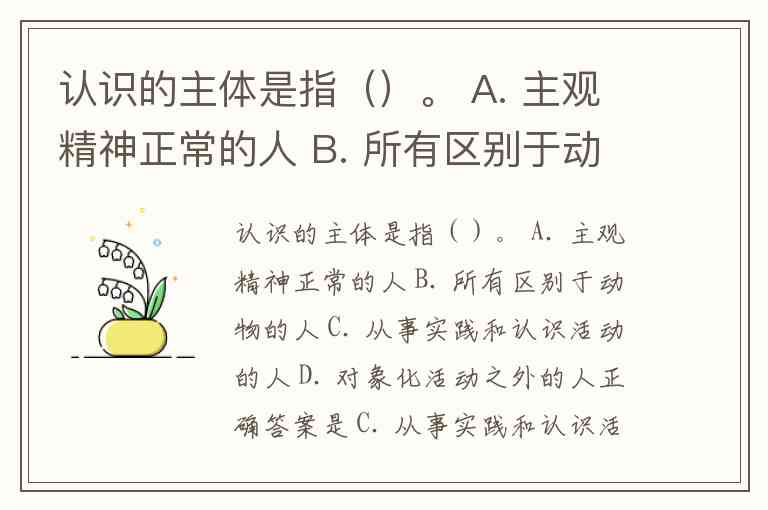 认识的主体是指()。 A. 主观精神正常的人 B. 所有区别于动物的人 C. 从事实践和认识活动的人 D. 对象化活动之外的人