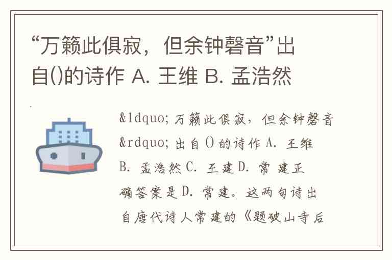 “万籁此俱寂,但余钟磬音”出自()的诗作 A. 王维 B. 孟浩然 C. 王建 D. 常 建