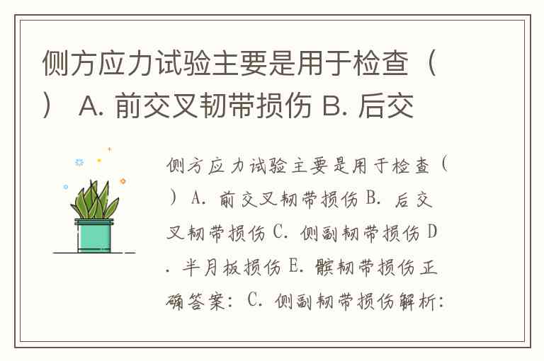 侧方应力试验主要是用于检查() A. 前交叉韧带损伤 B. 后交叉韧带损伤 C. 侧副韧带损伤 D. 半月板损伤 E. 髌韧带损伤
