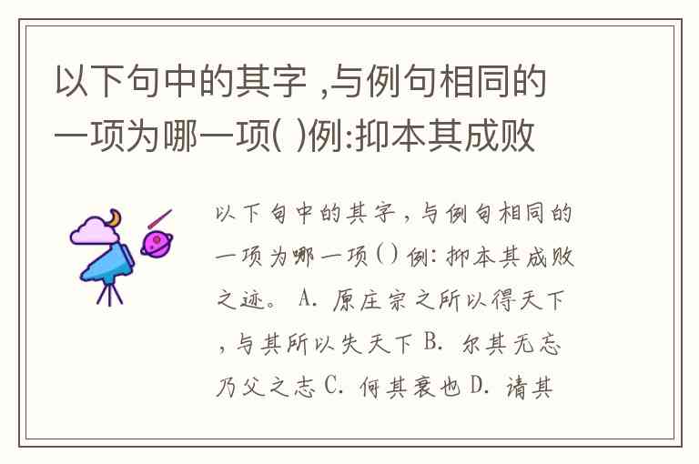 以下句中的其字 ,与例句相同的一项为哪一项( )例:抑本其成败之迹。 A. 原庄宗之所以得天下 ,与其所以失天下 B. 尔其无忘乃父之志 C. 何其衰也 D. 请其矢