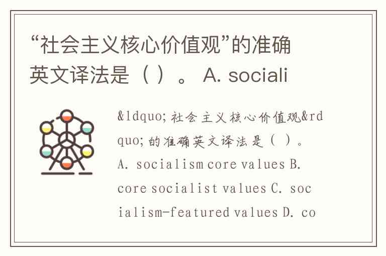 “社会主义核心价值观”的准确英文译法是( )。 A. socialism core values B. core socialist values C. socialism-featured values D. core values with Chinese characteristics