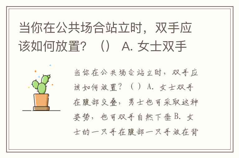 当你在公共场合站立时,双手应该如何放置?() A. 女士双手在腹部交叠,男士也可采取这种姿势,也可双手自然下垂 B. 女士的一只手在腹部一只手放在背后,男士也可采取这种姿势,也可双手放背后。 C. 男士双手在腹部交叠,女士也可采取这种姿势,也可双手自然下垂