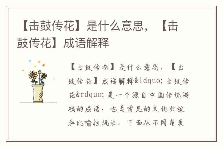 “击鼓传花”是一个源自中国传统游戏的成语,也是常见的文化典故和比喻性说法。下面从不同角度详细解释: