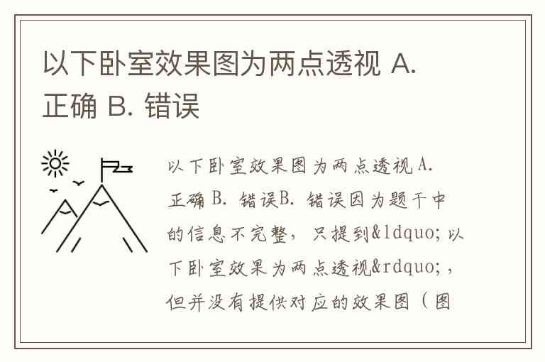 因为题干中的信息不完整,只提到“以下卧室效果为两点透视”,但并没有提供对应的效果图(图像)进行判断。在没有图的情况下,无法确认它是否是两点透视,因此该陈述无法直接判定为“正确”。从逻辑上,原题更像是一个缺少配图的判断题,所以选 B. 错误 更合理。