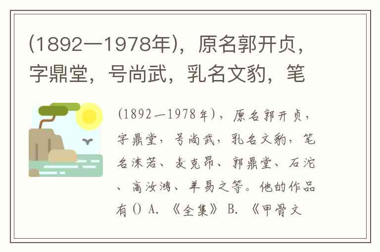 (1892一1978年),原名郭开贞,字鼎堂,号尚武,乳名文豹,笔名沫若、麦克昂、郭鼎堂、石沱、高汝鸿、羊易之等。他的作品有() A. 《全集》 B. 《甲骨文字研究》 C. 《中国史稿》 D. 《阿Q正传》