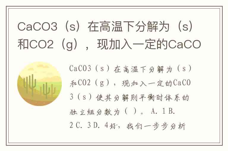 CaCO3(s)在高温下分解为(s)和CO2(g),现加入一定的CaCO3(s)使其分解则平衡时体系的独立组分数为( )。 A. 1 B. 2 C. 3 D. 4