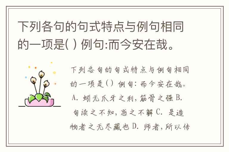 下列各句的句式特点与例句相同的一项是( ) 例句:而今安在哉。 A. 蚓无爪牙之利,筋骨之强 B. 句读之不知,惑之不解 C. 是造物者之无尽藏也 D. 师者,所以传道受业解惑也