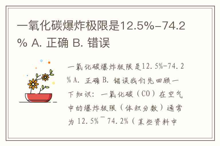 一氧化碳爆炸极限是12.5%-74.2% A. 正确 B. 错误