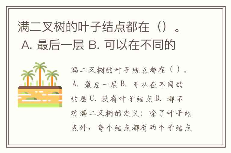 满二叉树的叶子结点都在()。 A. 最后一层 B. 可以在不同的的层 C. 没有叶子结点 D. 都不对