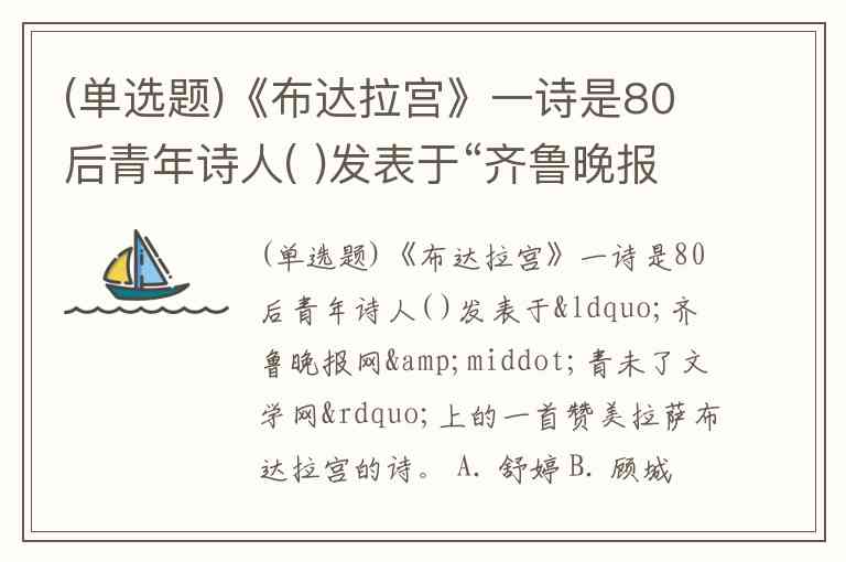 (单选题)《布达拉宫》一诗是80后青年诗人( )发表于“齐鲁晚报网·青未了文学网”上的一首赞美拉萨布达拉宫的诗。 A. 舒婷 B. 顾城 C. 时培建 D. 海子