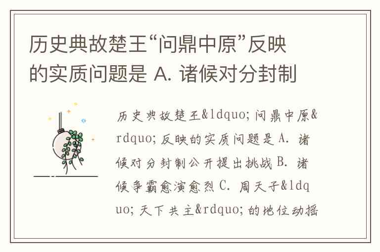 历史典故楚王“问鼎中原”反映的实质问题是 A. 诸候对分封制公开提出挑战 B. 诸候争霸愈演愈烈 C. 周天子“天下共主”的地位动摇 D. 西周治铸水平很高