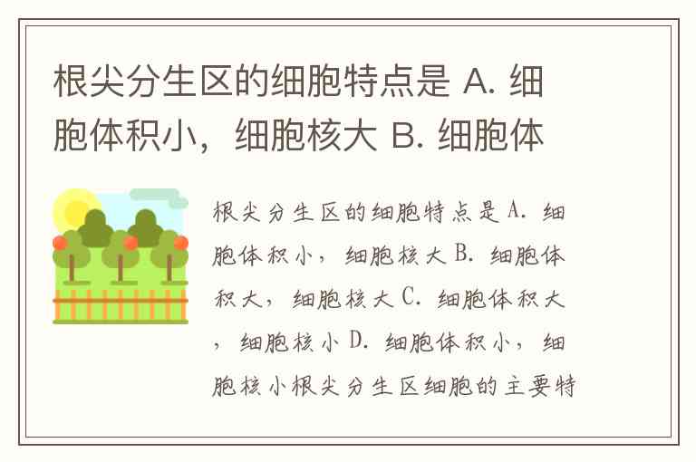 根尖分生区的细胞特点是 A. 细胞体积小,细胞核大 B. 细胞体积大,细胞核大 C. 细胞体积大,细胞核小 D. 细胞体积小,细胞核小