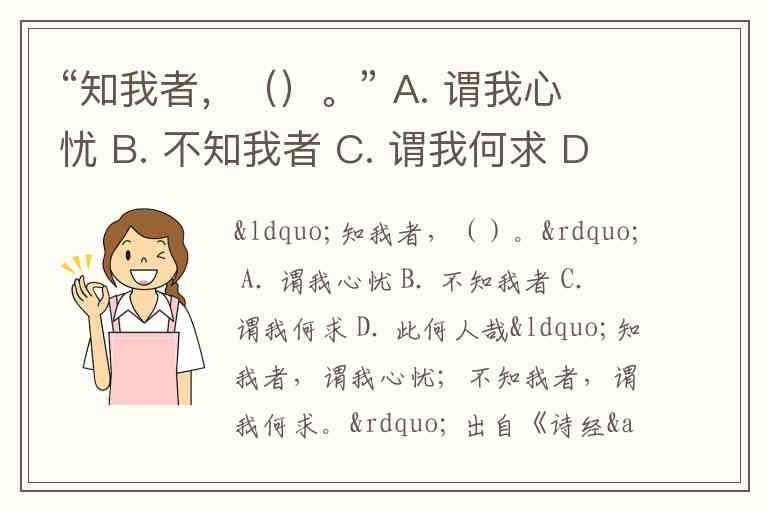 “知我者,()。” A. 谓我心忧 B. 不知我者 C. 谓我何求 D. 此何人哉